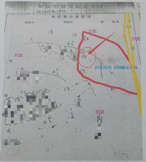 《林权证明》记载的77亩林地四至范围,也与《林地使用权现状登记表》不符。登记表中,本属五保户王某宽的《地岗》《杨叉洼》《棚岗2》三块林地被篡改,《茶林洼》林地面积同样被篡改,且《狗嘴洼》林地未登记,仅在王某超承包集体耕地合同中有记载。