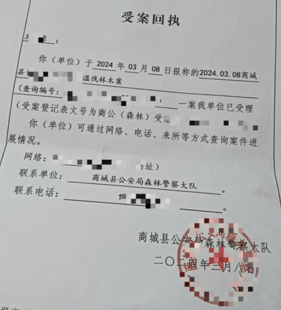 为解决问题,2024年3月8日,王某意就何某明滥伐林木案向商城县公安局森林警察大队报案,案件被受理。