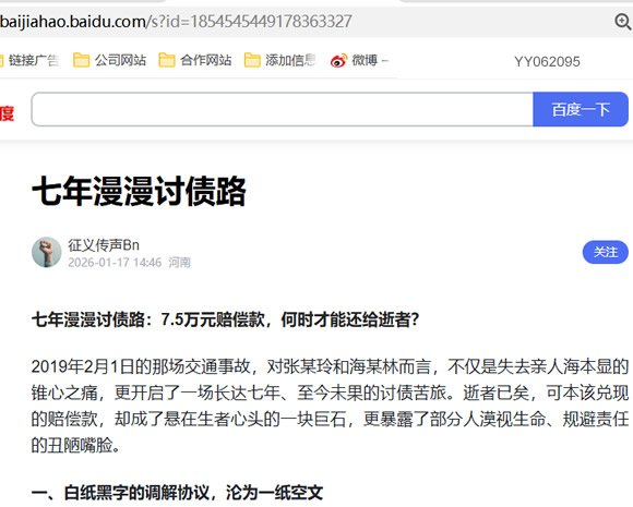 2019年2月1日的那场交通事故,对张某玲和海某林而言,不仅是失去亲人海本显的锥心之痛,更开启了一场长达七年、至今未果的讨债苦旅。逝者已矣,可本该兑现的赔偿款,却成了悬在生者心头的一块巨石,更暴露了部分人漠视生命、规避责任的丑陋嘴脸。