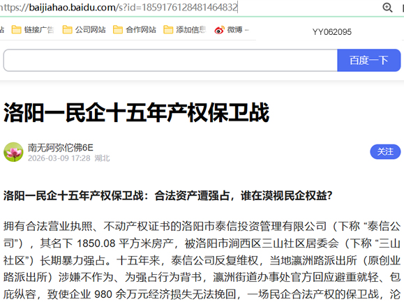 拥有合法营业执照、不动产权证书的洛阳市泰信投资管理有限公司(下称 “泰信公司”),其名下 1850.08 平方米房产,被洛阳市涧西区三山社区居委会(下称 “三山社区”)长期暴力强占。十五年来,泰信公司反复维权,当地瀛洲路派出所(原创业路派出所)涉嫌不作为、为强占行为背书,瀛洲街道办事处官方回应避重就轻、包庇纵容,致使企业 980 余万元经济损失无法挽回,一场民企合法产权的保卫战,沦为基层治理的荒诞困局。