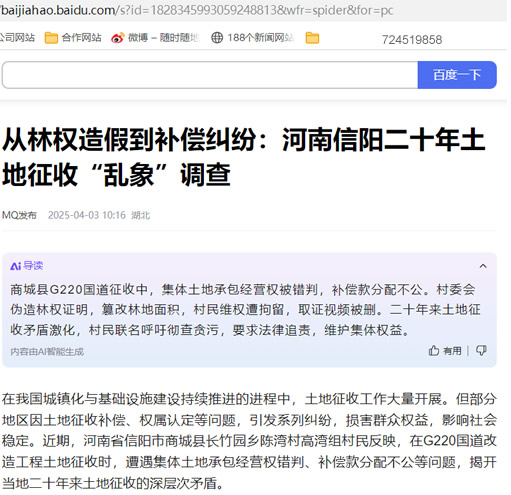 在我国城镇化与基础设施建设持续推进的进程中,土地征收工作大量开展。但部分地区因土地征收补偿、权属认定等问题,引发系列纠纷,损害群众权益,影响社会稳定。近期,河南省信阳市商城县长竹园乡陈湾村高湾组村民反映,在G220国道改造工程土地征收时,遭遇集体土地承包经营权错判、补偿款分配不公等问题,揭开当地二十年来土地征收的深层次矛盾。